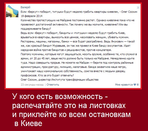 Завод у нас остановили, люди без з/п с осени, так вот они яростно кричат, дескать во всем виноват майдан. Когда им начинаешь объяснять, что мне зарплату перестали платить еще летом, так как в бюджете все своровано и майдан тут вообще никаким боком, они все равно настаивают на своем.