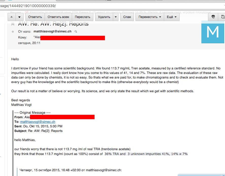 wolf Опубліковано: 15 жовтня 2015 Опубліковано: 15 жовтня 2015 Если это правда, там интересная фраза, что за эстрадиол, я не знаю, что ответить в этом случае. Может действительно правы те, кто говорит, что у нас лаборатории при анализах что-то путают и показывают многократно повышенное эстро после трена, а его нет у людей? Кстати обратите внимание на стиль написания письма иностранным контрагентом и на стиль написания Алекса ) Чем мне нравятся иностранцы, они всегда предельно вежливые в переписке. Сколько эту тему мусолить можно?уже все стало на свои места давно, ч писал уже по этому поводу раз 10.сдавали один и тот же трен из одной партии, одна лаба маленькая никому неизвесная 70е2, большая лаба синево показала 800е2.разные методы анализа выдают разные показатели.и в подавляющем большенстве своем все лабы делают анализом как синево.это все было на нашем форуме