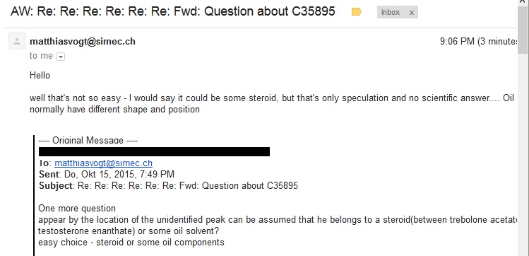 ZPHC Опубліковано: 16 жовтня 2015 Автор Опубліковано: 16 жовтня 2015 а теперь правильный перевод: "вольдемар": один еще вопрос. появляться на местоположении неизвестного пика можно предположить что он принадлежит стероиду(между трен а и тест е) или какой-то маслянный растворитель? легкий выбор - стероид или другой масляные компоненты Маттиас из Швейцарии : хелло ну это не так легко - Я бы МОГ сказать что это какой-то стероид, но это только спекуляции и не научный ответ.... масло имеет другую форму и позицию.