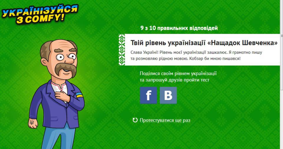 Erik Опубліковано: 11 вересня 2014 Опубліковано: 11 вересня 2014 https://ua.comfy.ua/?utm_source=banner_site..._version_autumn мой резалт 9 з 10 правильних відповідей Твій рівень українізації «Випускниця філфаку» Я володію рідною мовою вільно, як філолог: напам’ять цитую класиків української літератури, у вільний час влаштовую мовні вечори у «Львівській політехніці», а перед сном читаю блог Ірини Фаріон. Я знаю, що «Маша» — то форма не наша, а запрошуючи друга на борщ, звертаюсь до нього «Степане!», а не «Стьопа».