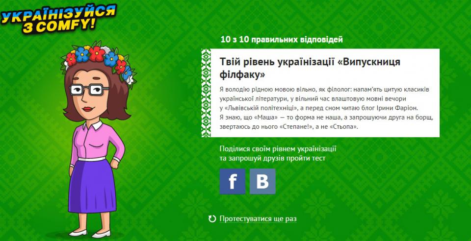 explosive Опубліковано: 11 вересня 2014 Опубліковано: 11 вересня 2014 8 з 10 правильних відповідей Твій рівень українізації «Випускниця філфаку» Я володію рідною мовою вільно, як філолог: напам’ять цитую класиків української літератури, у вільний час влаштовую мовні вечори у «Львівській політехніці», а перед сном читаю блог Ірини Фаріон. Я знаю, що «Маша» — то форма не наша, а запрошуючи друга на борщ, звертаюсь до нього «Степане!», а не «Стьопа».