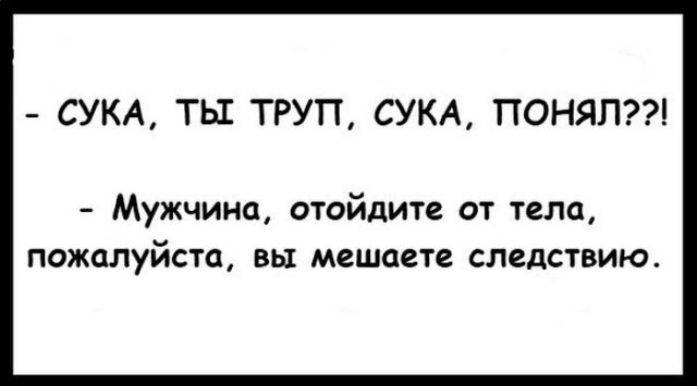 mr.TRS Опубліковано: 30 листопада 2014 Опубліковано: 30 листопада 2014 Свиня, що побачила на подвір'ї мангал, почала ловити мишей та гавкати на чужих... ----- Лише 1% населення вважає, що ярличок на одязі служить для того, щоб знати, як за цією річчю доглядати: прати, прасувати і т. д. Решта 99% визначають по ньому де зад, а де перед. ------ Новий тариф Київстар: Бла-бла-бла і немає бабла! ------- Буває, п'єш чай, макаєш печенько, і хопа! Воно розламалося, починаєш його виловлювати ложкою, а воно взагалі все розвалилося... І сидиш, як ідіот, п'єш херню якусь! ------- - Люба, подивися який день прекрасний! - На що ти натякаєш? - Ну ти ж сама сказала, що підеш від мене в один прекрасний день. ----- — Алло, Верховна Рада? Я б хотів працювати в уряді! — Ви що, ідіот? — А це обов’язкова умова? ------- Студентка зїла чорнобильську капусту і її груди збільшились в двічі.....тепер їх чотири!
