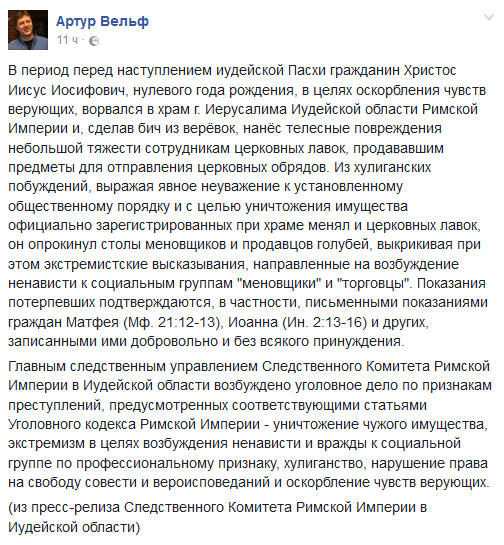OlegRO Опубліковано: 4 вересня 2016 Опубліковано: 4 вересня 2016 распяли за самопровозглашение себя выше главы Иудейской области