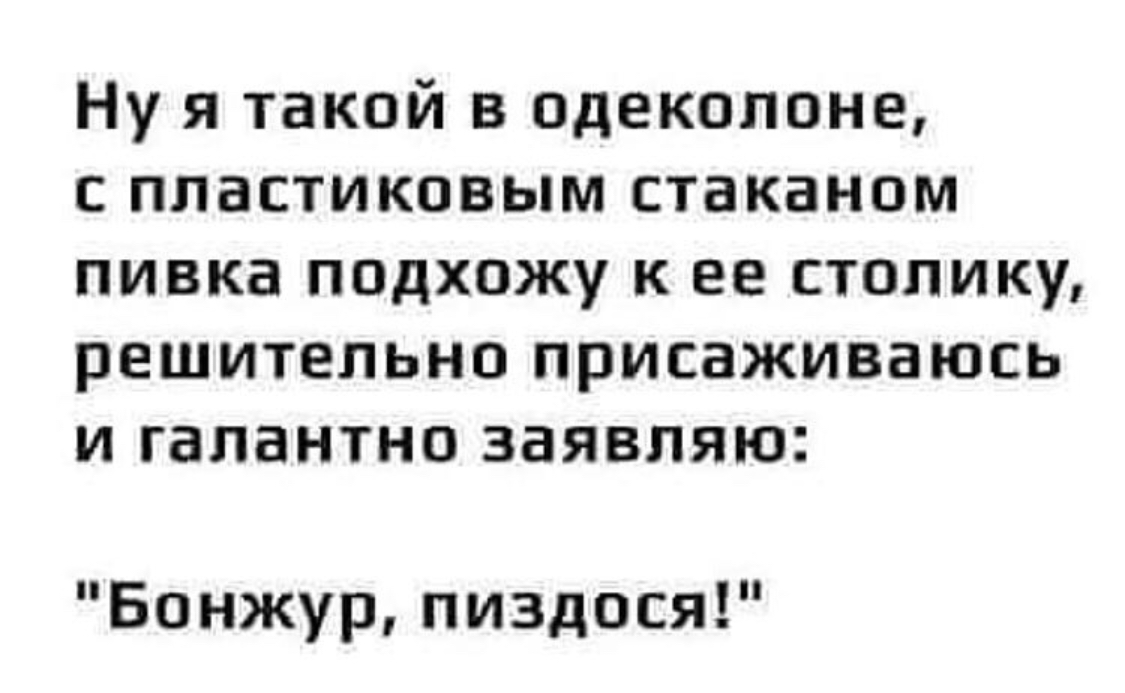 MaJ0r Опубліковано: 8 червня 2018 Опубліковано: 8 червня 2018 Смешной баянчик, можно в тему отношений: Муж: Вот представь. У тебя есть классная машина. Красивая такая. Твоя Мечта! Жена: Ну представила, и? =) Муж: Так вот. Эта машина неделю не может ездить, потому как у нее профилактика, а до этого 2 недели она к ней готовиться и тоже ездить не может. А в остальное время ездит только по настроению. И как тебе? Жена: А нах мне такая машина?! =) Жена: Стой!... ты на что намекаешь?!!!