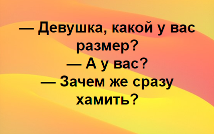 OlegRO Опубликовано 26 ноября, 2019 Опубликовано 26 ноября, 2019 Парень и девушка знакомяться на дискотеке. Он: — Пойдем на улицу что-то покажу! Выходят, парень озираеться по сторонам снимает свои штаны и достав из них член и вкладывает девушке в руку со словами: — Ну как, большой? Она в ужасе бросаеться от него в кусты с диким воплем. Бежит, ветки бьют по лицу, платье рвет о кусты, в голове мысли: "Говорила мама, что вокруг одни маньяки! Хоть бы не тронул! Скорее бы дом!!!" и орет как бешенная. Подбегает к дому, судорожно тычет ключ в дверь и тут ей на плечо ложиться рука. Она в ужасе поворачиваеться и видит Показатьдва огромных ох@евших глаза и слышит: — ПИСЮ ОТПУСТИ