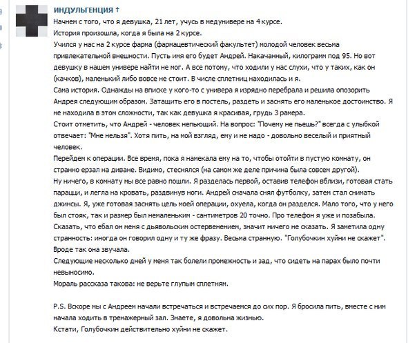 alex211284 Опубліковано: 1 серпня 2013 Опубліковано: 1 серпня 2013 а вот типо противоположное мнение, только сильно сомневаюсь, что это реальная телка писала, скорее всего задрот свои фантазии высказал))) Два месяца назад моя подруга бросила парня. Он работал продавцом в автосалоне, в 21 год это не так уж и плохо, занимался спортом, дарил ей подарки. Подруга бросила его в одночасье, толком ничего не объяснив. Ещё больше меня удивил тот факт, что через месяц она нашла себе другого. Ему 23 года, не работает, спортом не занимается, сидит дома и играет в онлайн игры. Своим решением подруга буквально шокировала меня. Парня мечты она променяла на дрыщеватого задрота. Любопытство взяло надо мной верх и я спросила: "Что за странный выбор?" Объяснение было простым. У спортсмена член был 10 см, а у задрота 19. Спортсмен просил постоянно готовить и стирать ему, а задрота это не волновало. Спортсмен после работы уставал и спал, а задрот ночью делал то, о чем предыдущий ее парень и не помышлял. И тут даже я призадумалась...