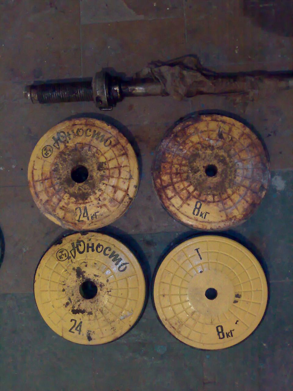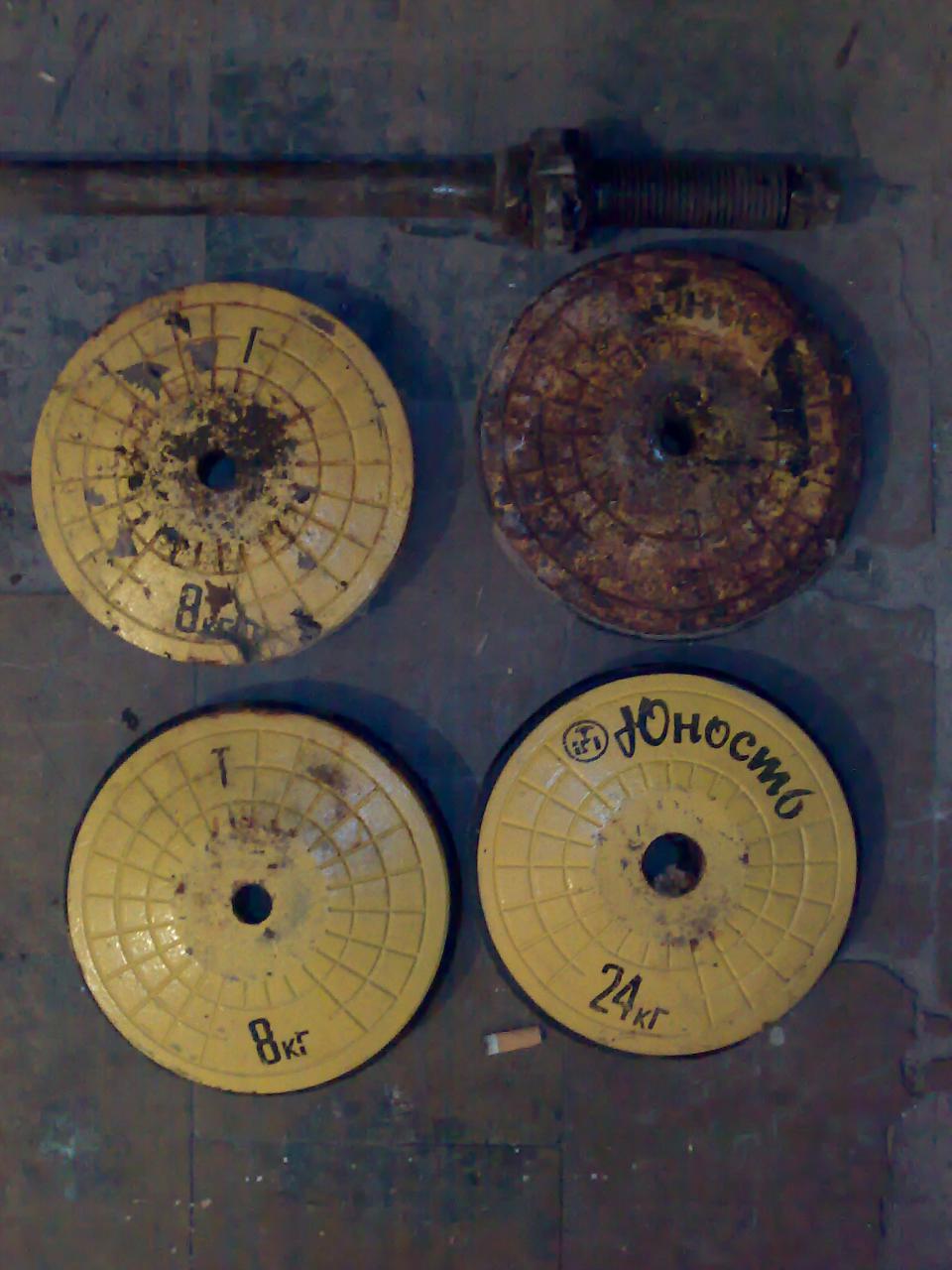 жаб Опубликовано 20 декабря, 2013 Автор Опубликовано 20 декабря, 2013 При дальнейших поисках найдено следующее: Гриф от штанги, общая длинна 144см, от замка до края как на фото 13см, диаметр посадки блинов 34мм, диаметр рабочей части 27,5мм. Гриф в остатках заводской упаковки и в родной смазке. Блинчик один, диаметр наружный 26,3мм, внутренний 35, толщина по ободу 15-16мм. Штанги или штанга "Юность". Грифоф (длинна рабочей зоны 94-95см, диаметр посадки блинов 20мм, диаметр рабочей части 29мм) 3шт, блинов 4шт состояние на фото. Блины кроме большого, и грифы сфотографированны с обоих сторон. Буду благодарен,если кто то подскажет цену на данные девайсы.
