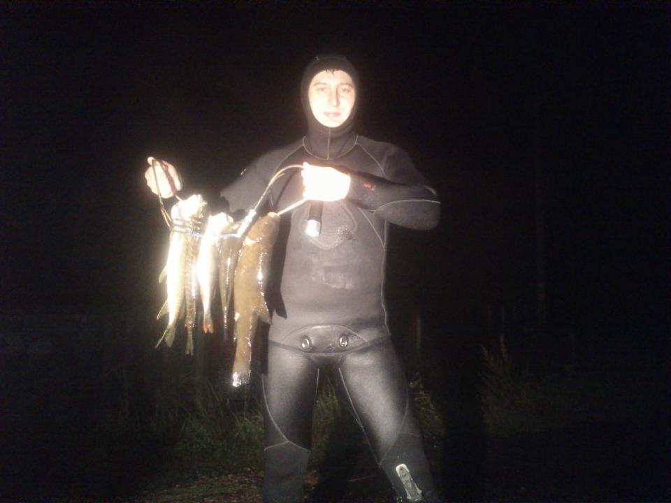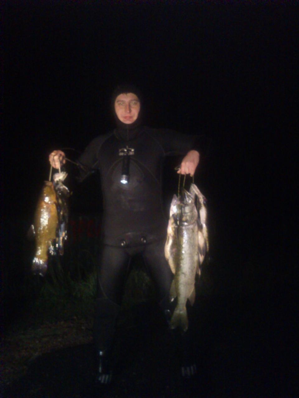 extremal Опубликовано 27 сентября, 2013 Опубликовано 27 сентября, 2013 (изменено) Лазил по камышам ночью. А он стоит красавец и ждёт меня. Прошил его насквозь в районе анального плавника. Ну он сразу накрутил фал вокруг камышей, вокруг меня, взмутил воду, Пытался его под мышку взять - скользкий как мыло. Не рискнул добивать в воде , боялся пораниться ножом. Кое как вылез с камышей, снял с себя кучу водорослей и насадил на кукан. У товарища улов интереснее - щука на 3,5 кг. и караси по килограмму. Сели акумы в фонаре основном. Пришлось плыть на берег раньше, а только за щукой полтарушной погнался((. Изменено 27 сентября, 2013 пользователем extremal