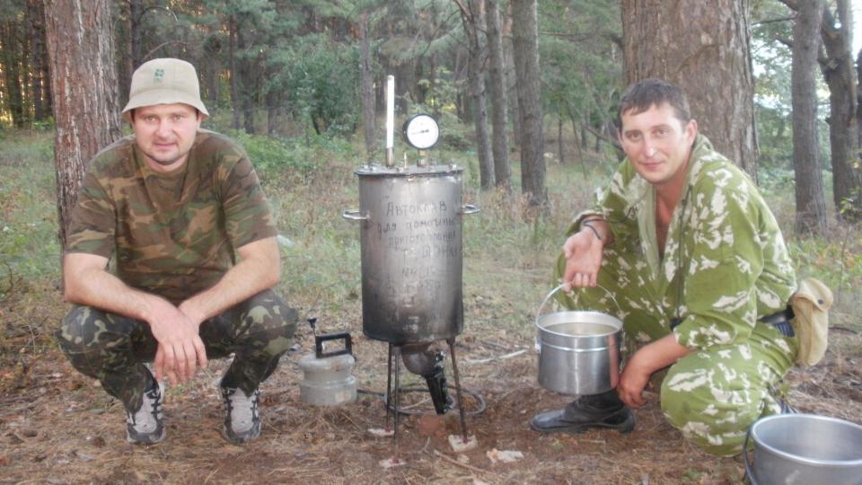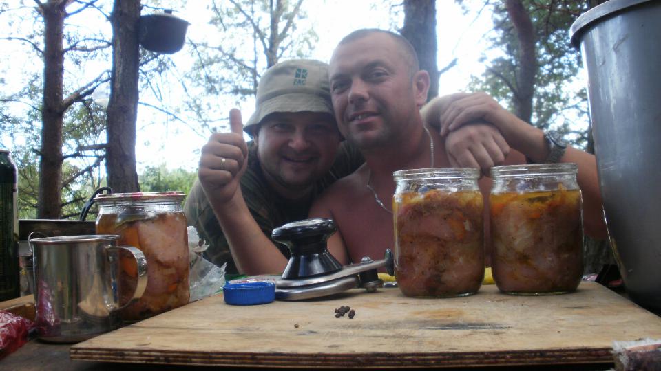 extremal Опубликовано 29 августа, 2010 Опубликовано 29 августа, 2010 Часть вторая. Нехилый сом был сфотографирован раз 25 в разных позах. Предлагаю подборку самых эффектных фотографий . А это хозяин сома майор Гусев. Как известно, мясо не должно пропасть, поэтому было принято ключевое решение- делать сомовью ТУШЁНКУ! Дело очень интересное, тем более, что специально для этого момента, с берега на остров был доставлен автоклав, консервный ключ, бензиновая горелка с треногоя, штук 50 банок и крышек, и даже компрессор с аккумулятором. Всё это добро необходимо для создания шедевра рыбацкой кулинарии - ТУШЁНКИ! Назначенная Лёшей цена в 100грн. за банку вполне оправдывает приложенные усилия и затраты. Процесс её приготовления достаточно сложен, но результат стоит труда. Вначале сом потрошится и разделывается на филе и стейки. Далее полностью снимается шкура и удаляются все кости. Процесс занял 1,5 часа. В результате имеем 2-е кастрюли костей для супового набора и килограмм 5,5 чистого мяса. Далее чистится много лука и морковки и всё это тушится на сковородке с солью и специями. Мясо не промывается и перемешивается в ведре с полученной зажаркой. Запах и вид получаеются оболденные, так и хочется сьесть. Скажете- не возможно!. Деликотес "Малосольный сом под перчиком с лаврушкой" стал главной закуской под водку тем вечером. Похоже на суши и реально вкуснее сельди. Но пойдём далее по рецепту... На дно банки 500мл кладём 2 шарика чёрного перца, лавровый листик, мясо сома с зажаркой. Потом заливаем домашним подсолнечным маслом на палец ниже крышки, Ножом тыкаем в мясо чтоб вышел весь воздух. Сверху ещё перчика и листок лавра. И всё, можно закатывать сырым.! Далее идёт в ход техника. Банки укладываем в автоклав. Намазываем резиновую прокладку густо мылом (чтоб не приварилась), наливаем в бак воды с речки на 1,5 пальца выше крышек. Закручиваем крышку гаечным ключём, вставляем термометр. Автоклав с помощью специально привезённого компрессора накачивается через нипель до 1,5 атмосфер, после чего ставится на бензиновую гарелку на 1-1,5 часа. Если конкретнее, то ждём пока температура поднимется до 106 градусов. Лампа выключается и бак остывает к утру. Всего было произведено 12 банок рыбы в масле, одна экспериментальная в томате и одна по спецзаказу для Алексея чисто из сомовьей шкуры. Заказчик сказал что этот мармелад будет открыт только в новогоднюю ночь....:) А теперь скажите... После всех этих трудов, Вы бы продали свои получившиеся 13 баночек тушёнки с 9кг сома меньше чем по сотне за штуку!?