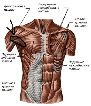 StrongMen Опубликовано 19 мая, 2014 Опубликовано 19 мая, 2014 В очередной раз вляпался в череду травм. Поначалу болело плечо, за месяц вроде бы залечил. Вроде бы все стабилизировалось, я даже начал делать жим лежа и упражнения на дельты (маленький вес - многоповторка), и тут неожиданно, во время отдыха между тренировками у меня начала болеть грудь и часть плеча (болит в месте, которое обозначил на картинке). В состоянии покоя ничего не беспокоит, болит во время поднятия руки а также, во время всех жимовых движений (даже ночью, когда переворачиваюсь, не могу опираться на больную сторону). Болит уже больше двух недель с одинаковой интенсивностью (динамики в лучшую сторону нет). Что касается тренировок, то полностью исключил плечевой пояс (приседаю, делаю бицепс, трицепс, трапецию и становую тягу). К травматологу ходил нормального ответа и лечения не получил (одни говорят тендинит, другие надрыв связки). Еще раз повторю, боль появилась не на тренировке и не от физической нагрузки. Что можете посоветовать? Возможно, у кого-то было что-то подобное?