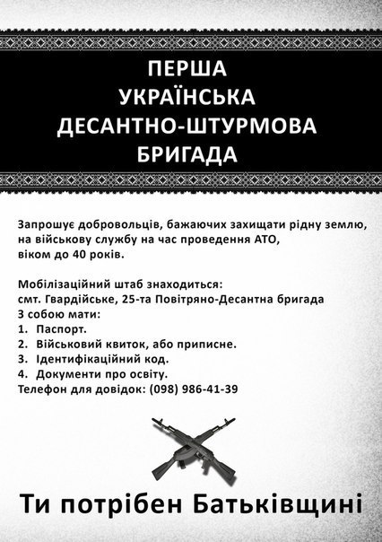 fantom77 Опубликовано 19 ноября, 2014 Опубликовано 19 ноября, 2014 Может кому будет интересно. Перша Українська Десантна Штурмова Бригада запрошує добровольців віком з 18 до 40 років для служби в зоні АТО. Важлива інформація: - ця бригада є першою за роки незалежності, яка створюється з нуля; - командир бригади - свідомий українець, вимогливий до дисципліни у війську, досвідчений, загартований у боях офіцер. В минулому командир першого батальйону 25-ї бригади. Брав Савур-могилу, воював у Шахтарську, неодноразово стримував та атакував ворога в зоні АТО. - окрім бійців потрібні солдати підрозділів забезпечення, водії, спеціалісти з відновлення техніки, медики, комп'ютерщики, діловоди, зв'язківці та інші люди, для роботи в штабі. Штаб буде знаходитись біля Краматорська, в умовно безпечній зоні. Стать принципового значення не має. Сайт.
