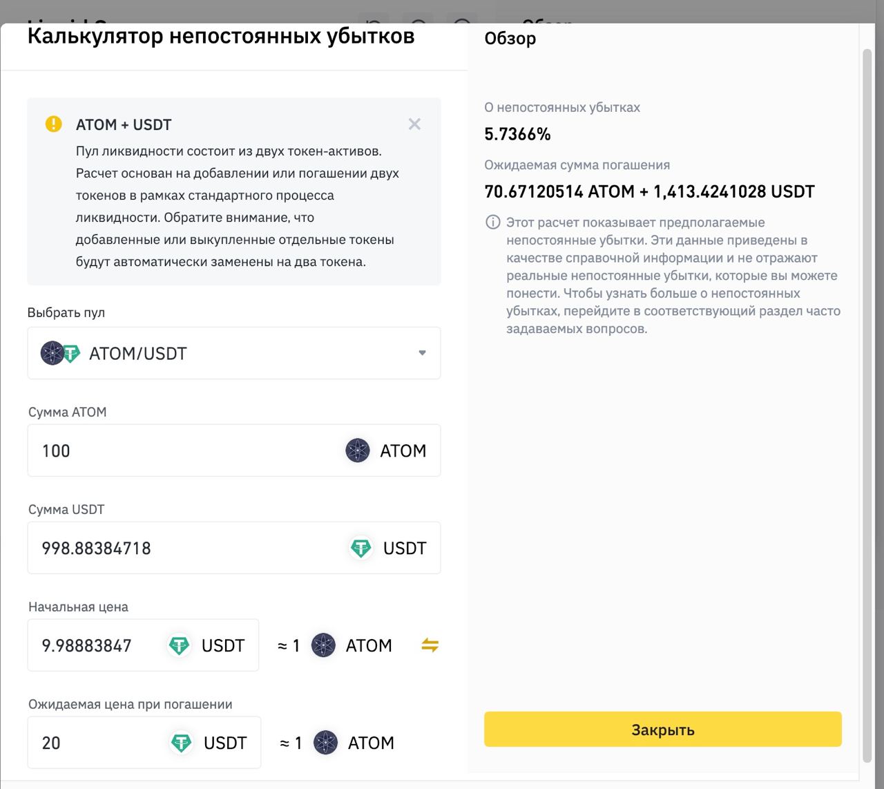 Млд Опубліковано: 2 серпня 2022 Опубліковано: 2 серпня 2022 давай на прикладі росту. В мене є токен, який буду продавати тільки за умови х5-х10 від поточних значень. Тобто якщо це трапиться через рік, то й ок. Я щось отримаю, втрачу якщо захочу продати свій токен по новій ціні? Відсоток 20% річних давай на прикладі росту MaJ0r,Какой токен и какой пул? Ты же не стейкаешь, ты добавляешь в пул ликвидности. В пуле всегда примерное соотношение 50:50 должно быть, в идеале. К примеру, у тебя пул ликвидности ATOM/USDT. Добавляешь в пул 100 ATOMов по 10$ каждый и 1000 USDT. В сумме 2000$ Потом Атом растет до 20$. ТЫ решаешь достать свою ликвидность с пула. 70 Атомов и 1400USDT +процент за фарминг. В сумме ~2800$. Если бы просто держал 100 атомов и 1000USDT, и не заливал в ликвидность в сумме было бы 3000$ Показать