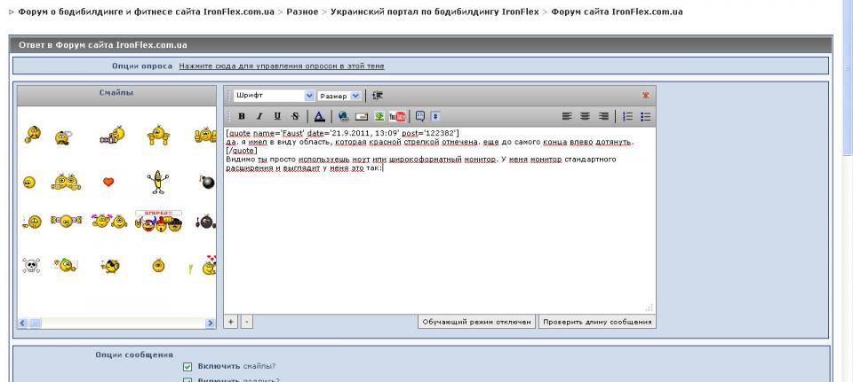 Faust Опубликовано 21 сентября, 2011 Опубликовано 21 сентября, 2011 Всмысле еще больше окно для смайлов сделать? А то я не совсем понял о каком меню идет речь. да. я имел в виду область, которая красной стрелкой отмечена. еще до самого конца влево дотянуть.