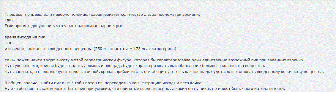 Outlawif Опубликовано 10 ноября, 2016 Опубликовано 10 ноября, 2016 Кирилл, а можешь ты решить такую задачу: - Дано кол-во вещества (% тестостерона в, допустим, тестостерона пропионата); - ППВ эфира; - время выхода на пик; - формула полураспада, по которой строится график спадания после достижения пика (для начала полураспадом на этапе выхода на пик пренебрегаем, оставляем на закуску); - объем крови; - молярная масса тестостерона . Что там тебе еще может понадобиться ? И вычислить пик. Математически. Т.е. с какой высоты на графике должна спадать функция по заданной формуле, чтобы площадь под графиком соответствовала вколотому веществу. Так пик дан или надо вычислить? Если мы время выхода на пик уже знаем, и знаем ППВ, то могу построить более-менее правдоподобный график. Насчет самого пика не уверен, сходу не отвечу, надо подумать. Я более чем уверен, что это возможно, но готового ответа в голове нет, поэтому не буду придумывать. Вывести формулу...ммм... Если разбить график на отрезки, скажем на 3: до выхода на пик, в окрестностях пика и после пика, то можно и формулу сделать, отчего ж нет. Точнее 3. Цельную формулу тоже можно, но она скорее всего будет настолько задрочено выглядеть, что окажется бесполезной для практики. Это к сожалению невозможно. Зная ППВ можно рассчитать пределы в которых должно попасть пиковое значение, но не точное значение. Оно зависит от свойств препарата. Т.е. график может быть более пологим или менее пологим, от этого будет зависеть пик.