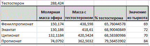 andreyyy Опубликовано 17 марта, 2017 Опубликовано 17 марта, 2017 по идее расчет таков мол масса теста 288 плюс вес эфирного хвоста пусть проп 74 получаем 362 теперь считаем долю теста 288/362=0,795 умножаем на 100 получаем 79,5% теста в тесто пропионате т.е. в 1г пропика 795мг чистого тесто. Та таблица может по-другому посчитана, может я что-то не учел Мне кажется, что прибавляя молярную массу эфирного хвоста к молярной массе тестостерона, ты смешиваешь разное количество молекул.