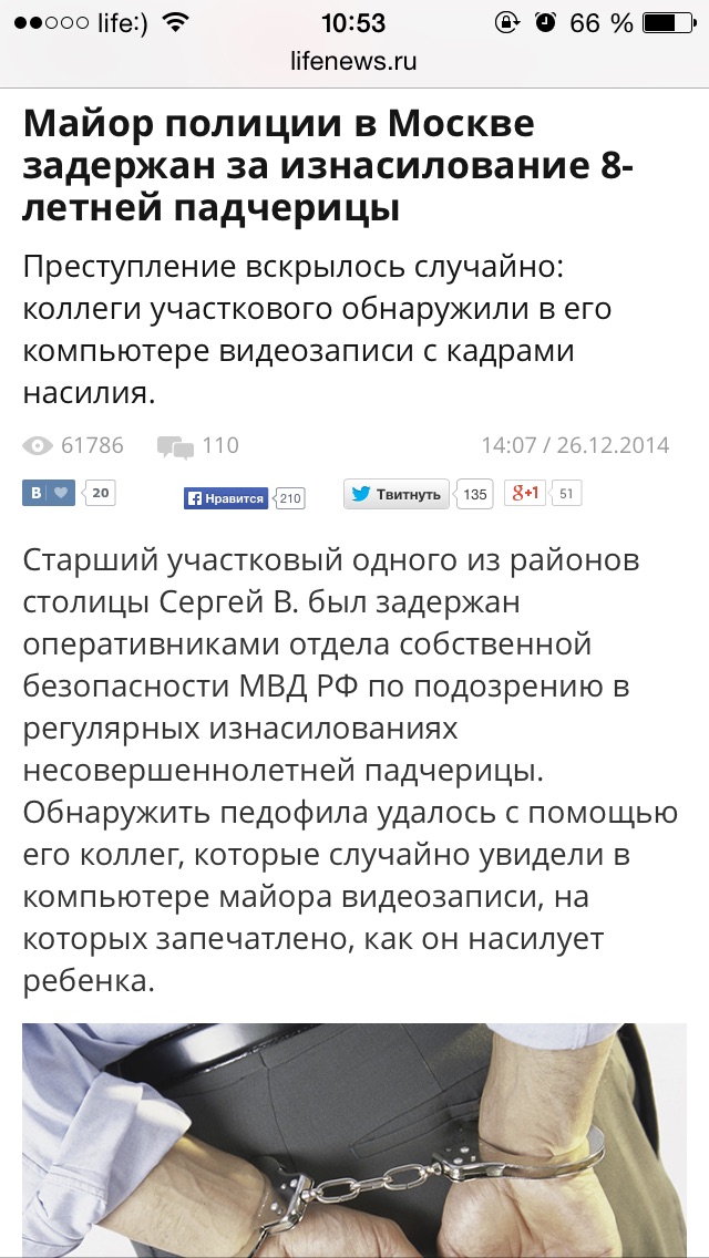 mad76 Опубліковано: 15 січня 2015 Опубліковано: 15 січня 2015 И не говори В Подмосковье отец изнасиловал 10-летнюю дочь Заявление на мужчину написала его жена, узнав о случившемся. Это к чему?
