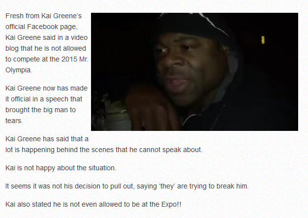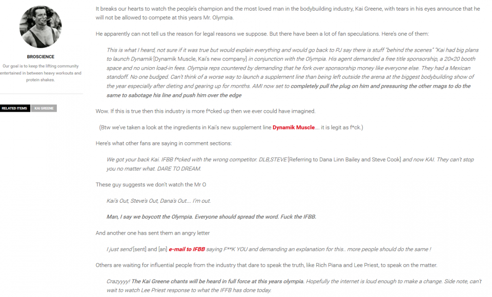 Garon Опубликовано 15 сентября, 2015 Опубликовано 15 сентября, 2015 Это разбивает наши сердца, чтобы наблюдать, народный чемпион и самый любимый мужчина в бодибилдинг-индустрии, Кай Грин, со слезами на глазах объявляет, что он не будет позволено конкурировать на этом лет мистер Олимпия. Он, видимо, не может сказать нам причину, по юридическим причинам мы предполагаем. Но там были множество фанатских спекуляций. Вот один из них: Это то, что я слышал, не уверен, было ли это правдой, но объяснило бы все и вернулся бы, чтобы ПИДЖЕЙ сказать, что есть вещи ”за кулисами” ”Кай были большие планы запустить новый [Новый мышцу, Кай новую компанию] в сочетании с Олимпии. Его агент потребовали бесплатно в качестве титульного спонсора, в 20Ч20 бут пространства и нет Союза нагрузки-в тарифах. Олимпия повторений возразил, потребовав, чтобы он раскошелиться на спонсорские деньги, как и все остальные. У них была мексиканская дуэль. Никто не сдвинулись с места. Не могу придумать худший способ запустить дополнить строкой, чем остаться за пределами арены бодибилдинга на крупнейшем шоу года особенно после диеты и готовится месяцами. АМИ теперь набор полностью махнуть рукой на него и давит на другие мэгс сделать то же самое саботировать свою линию и давить на него через край Вау. Если это правда то эта отрасль является более х* * ню тогда мы могли себе представить. (Кстати мы сделали посмотрите на ингредиенты в Кая новых дополнить строкой Новый мышца.... это законно как F*СК.) Вот то, что другие поклонники говорят в комментариях: Мы получили вашу спину Кая. Гимнастики ifbb х* * ню с неверной конкурента. ДЛБ,Стив [ссылаясь Дана Линн Бэйли, Стив Кук] и теперь Кай. Они не могут остановить вас несмотря ни на что. СМЕЛ И МЕЧТАТЬ. Эти парень предлагает нам не смотреть на мистера О' Кай ушел, Стив ушел, Дана вышла.... Я выхожу из игры. Мужчина, я говорю, что мы бойкотировать Олимпия. Каждый должен распространить слово. Нахуй гимнастики ifbb. И еще один отправила им гневное письмо Я просто отправить [Отправлено] и [К] Е-mail для гимнастики ifbb говоря ж**K вы и требовательных объяснение этому.. больше людей должны делать то же самое ! Другие ждут влиятельных людей из индустрии, которые осмеливаются говорить правду, как Рич Пиана и Ли священника, чтобы высказаться по этому поводу. Crazyyyy! Каи Грин песнопения зазвучат в полную силу в этом году "Олимпия". Надеюсь, в интернете достаточно громко, чтобы внести изменения. Примечание стороны, не могу ждать, чтобы смотреть ли священник ответ, что IFFB сделал сегодня.