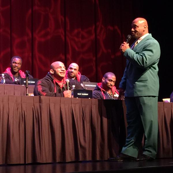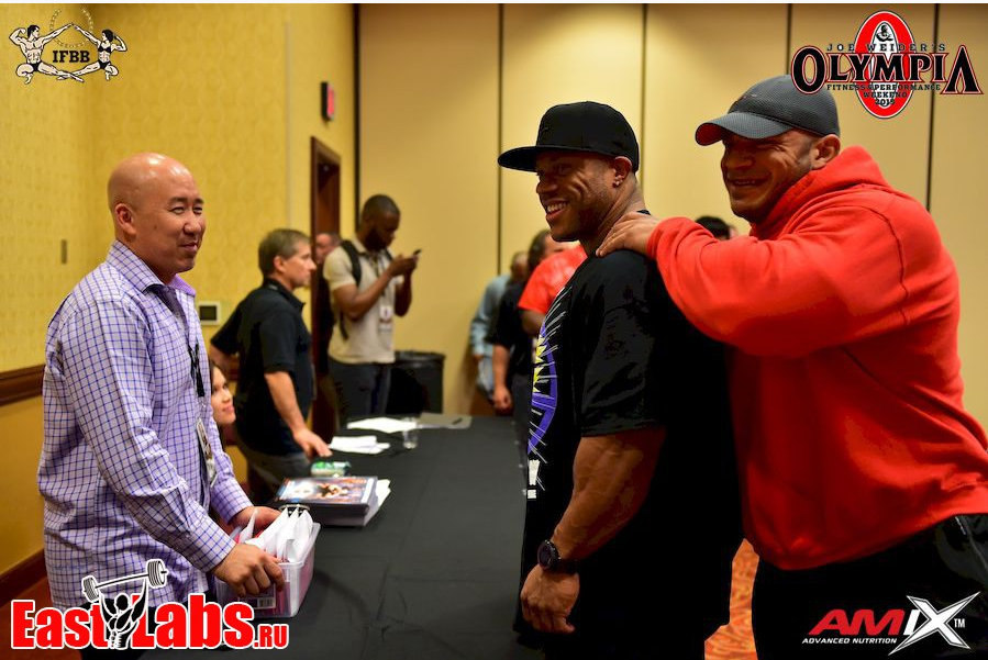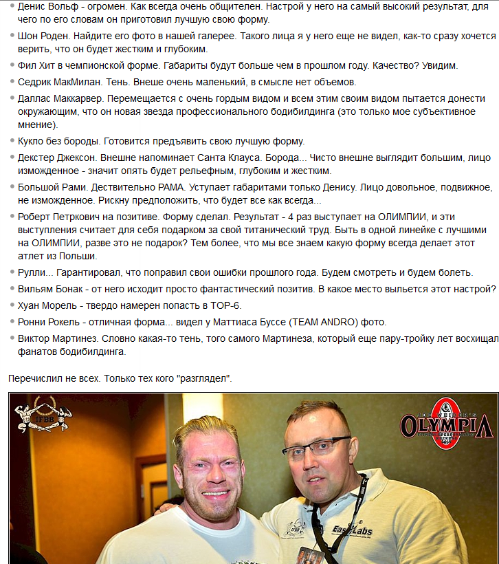 SHOTA Опубликовано 18 сентября, 2015 Опубликовано 18 сентября, 2015 2015 Mr.Olympia Press Conference - день второй сс конференция прошла в теплой дружественной обстановке. Боб Чичерилло и Деннис Джеймс, ведущие мероприятия, очень старались "разогреть" происходящее действо, задавали много достаточно провакационных вопросов. но... Но пресс конференция прошла в теплой дружественной обстановке. Много раз звучало имя Кая Грина. Основное, что я услышал практически от всех атлетов, что он совершил большую ошибку, он должен был себя и вне сцены вести как PRO и не считать себя кем-то особенным, отличным от других. Сожаления, большого сожаления, что его не будет на подиуме никто не выразил. Общее впечатление от увиденногои от услышанного чрезвычайноположительные. Фил Хит обозначил своим главным соперником Декстера Джексона, тепло отозвался о Родене и Вольфе. Самая горячая поддержка зала была оказана "местному" атлету, Денису Вольфу. Местный потому что живет в Лас Вегасе, местный потому, что самый открытый. Денис будет бороться за первое место. В этом ему многие хотят помешать, но эти ребята достойны уважения. На меня больше всего произвело лицо... сухое-присухое и размеры, которые нельзя скрыть никаким костюмом, даже если это NEBBIA - Декстера. Вчера он был с бородой, сегодня гладко выбрит. Чисто зрительно смотрится шире Фила. По моему будет вот так... TOP-10: 1. Warren, Branch, USA 2. Winklaar, Roelly (Egberton), Curacao 3. Jackson, Dexter, USA 4. Elssbiay, Mamdouh, Egypt 5. McMillan, Cedric, USA 6. Kuclo, Steve, USA 7. Wolf, Dennis, Germany 8. Morel, Juan, USA 9. Rhoden, Shawn, USA 10. Heath, Phil, USA TOP-5: 1. Wolf, Dennis, Germany 2. Rhoden, Shawn, USA 3. Heath, Phil, USA 4. Jackson, Dexter, USA 5. Elssbiay, Mamdouh, Egypt
