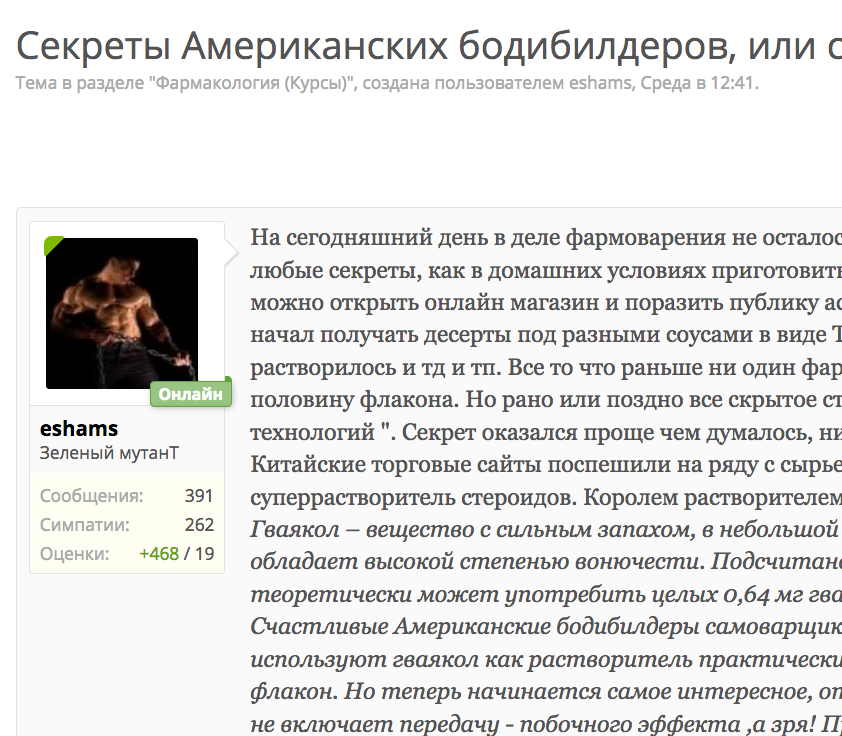 На сегодняшний день в деле фармоварения не осталось секретов. Любой более менее приличный заморский сайт раскроет вам любые секреты, как в домашних условиях приготовить самые изысканные формы анаболических стероидов, да что там себе, можно открыть онлайн магазин и поразить публику ассортиментом выпускаемой продукции. Словно из рога изобилия народ начал получать десерты под разными соусами в виде Туринабола на масле, Оксандролона, Оксиметолон, невообразимые миксы самых не смешиваемых препаратов на масле, все то что не растворялось растворилось и тд и тп. Все то что раньше ни один фармацевт в заводских условиях сделать не мог, хоть разбавляй спиртом половину флакона. Но рано или поздно все скрытое становится явным, забугорные сайты раскрыли все секреты подобных " технологий ". Секрет оказался проще чем думалось, никаких секретных машин и космических технологий не понадобилось. Китайские торговые сайты поспешили на ряду с сырьем для производства ААС и различных масел, выставить этот секрет как суперрастворитель стероидов. Королем растворителем нерастворимого оказался обычный Гваякол! Что это такое и с чем его едят? Гваякол – вещество с сильным запахом, в небольшой концентрации придает продуктам аромат копчения. Вещество обладает высокой степенью вонючести. Подсчитано, что средний человек в течение дня вместе с ароматизаторами теоретически может употребить целых 0,64 мг гваякола. По шкале вонючести это вещество занимает 1 !!!! место. Счастливые Американские бодибилдеры самоварщики и большая часть Американского и Европейского андеграунда используют гваякол как растворитель практически ВО ВСЕ!!! препараты ААС!!! В средней дозировке 1-1.5 !!!!!!!! мл на 10 мл флакон. Но теперь начинается самое интересное, отуманеные от упавшего счастья разнообразия АСС разум бодибилдера не включает передачу - побочного эффекта ,а зря! Про продавцов этой отравы упоминать не буду, в данном случае светлая перспектива огромного заработка перекрывает все человеческие качества. Лично я связываю массовые смерти бодибилдеров последних лет именно на Гваякол. Данное вещество обладает накопительным эффектом и сохраняется в тканях и костной ткани долгое время, вспомните Американские бодибилдеры ежедневно вкалывают от 10 до 30 мг этой дряни ежедневно в составе Анавара, Туринабола на масле и тд ( прим. автора ). При этом само масло, в котором стероид растворен Гваяколом имеет ужасно вонючий запах, выше мы отметили высокую шкалу вонючести данного вещества, чем отметились Мексиканские андеграундные компании, они используют Гваякол растворяя им все виды ААС тестостероны и нандролоны. Разумеется никаких клинических исследований бодибилдеры не проводили, ни один врач клиницист целенаправленно не будет травить других людей, если это не Доктор Мориати. Какую опасность это несет обывателю и чего можно ждать от использования препаратов содержащих в своем составе Гваякол? Летальная доза 36 г/человека!!! Хроническое отравление ГВАЯКОЛОМ- в крови - эозинофилия, увеличение СОЭ, резко выраженный астеноневротическнй синдром, понижении или повышении температуры тела, полиурии. Быстро проникает через кожу, и 2 г ГВАЯКОЛА!!!!!! или даже меньше могут вызвать слабость, падение температуры тела, коллапс и смерть.