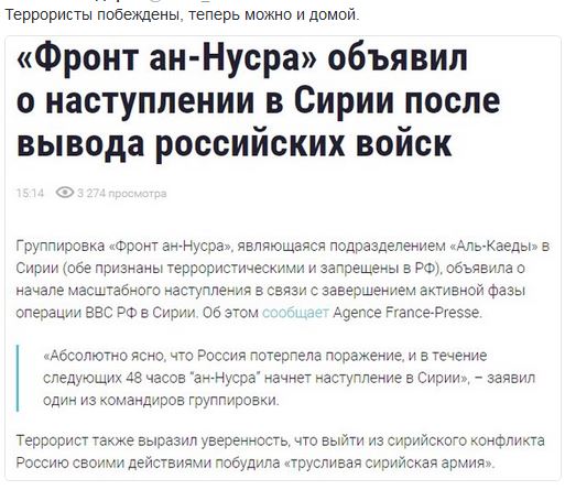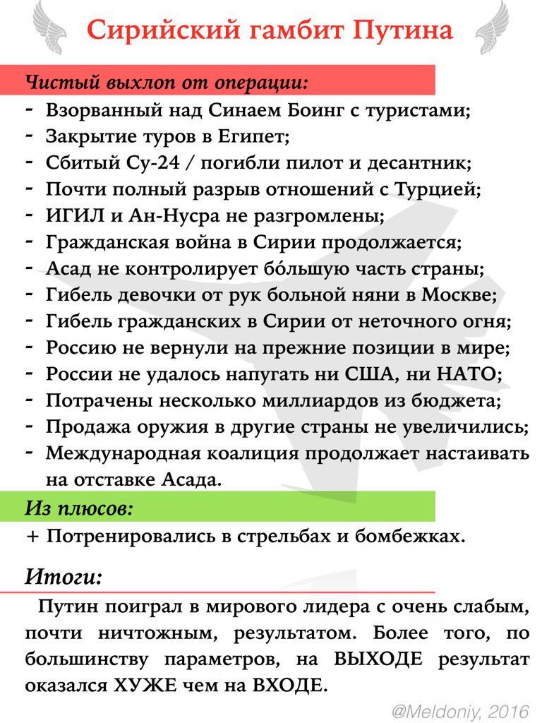 OlegRO Опубліковано: 15 березня 2016 Опубліковано: 15 березня 2016 неделю назад https://www.youtube.com/watch?v=c7BGRlMSmOU твиты Любопытно, что для того, чтобы ввести войска в Сирию необходимо голосование в Совфеде, а чтобы вывести-нет Россиянам можно только посочувствовать: падишах без объяснений решает, ввести войска или вывести их; разосраться со всем миром или нет. А вы видели, как дерзко и решительно мы вывели наши войска? Ни у кого разрешения не просили! Взяли и вывели! Только сверхдержава так может! Подряд на строительство Триумфальной Арки уже выиграл Аркадий Ротенберг. Ответственным за строительство назначен Дмитрий Рогозин - Надеемся, российским военным, спешно сбегающим из Сирии, разрешили взять с собой по паре килограммов турецких помидоров. Немного обсирились...