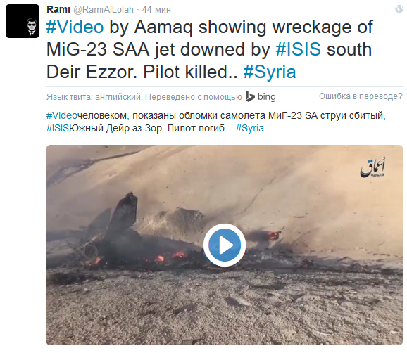 Garon Опубліковано: 14 липня 2016 Опубліковано: 14 липня 2016 ИГИЛ сбит очередной асадовский МИГ-23, пилот уничтожен, юг Дей эз-Зор.