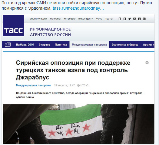 Дагот Опубліковано: 24 серпня 2016 Опубліковано: 24 серпня 2016 ССА в центре Джараблуса после более чем 2 лет как ИГИЛ их выбили от туда