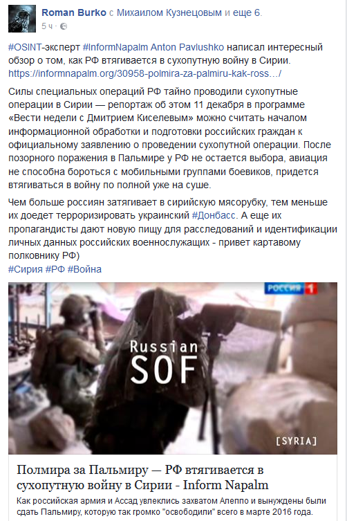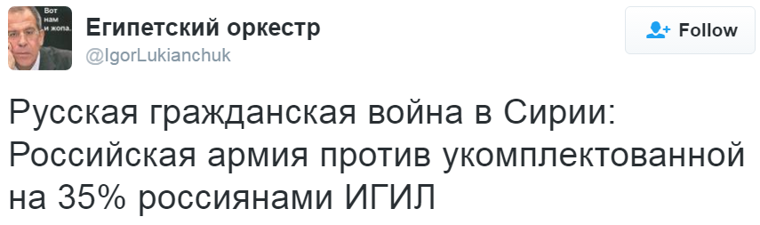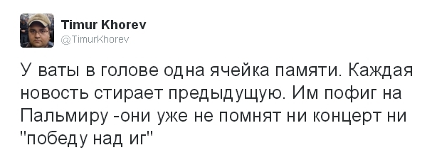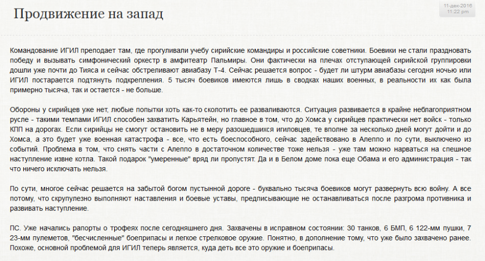 fantom77 Опубликовано 12 декабря, 2016 Опубликовано 12 декабря, 2016 РФ сдало Пальмиру Исламскому госсударству, позволив тому захватить большие обьемы советского вооружения включая танки и БМ-грады, а также БК к ним. В силу того, что большинство офицеров Игил заканчивали военные институты ссср еще со времен Садама и у рф осталась в Сирии большая агентурная сеть еще от КГБ, можно смело предположить, что мы стали свидетелями специальной операции по передачи вооружений Айсису. Версия о сотрудничестве Путина и Игил, многое обьясняет. Становится ясно, как было возможно провести симфонический концерт без единого выстрела, после первого "освобождения" Пальмиры. Также это дает ответ, почему от бомбежек Сирии космическими войсками РФ страдают в основном гражданские, госпиталя, гумконвои и Силы умеренной оппозиции воюющей с Асадом. Принимая эту версию, перестает удивлять официальная цифра воюющих за Игил граждан РФ - 10000 человек. Поставки же оружия террористическим организациям, вообще привычная практика для России - они официально поддерживают Хизбалу, террористов в Ордло, КНДР. При этом в самой РФ запущена мощная информационная операция по дезинформированию Мира и своего населения для сокрытия своей террористической деятельности. Мало того, на уровне закона, при упоминании Игил в СМИ требуется добавлять "запрещенный в России". Все это часть специальной операции по введению противника в обман. Так уже было с Крымом: "Это не мы и нас там нет". Действия Путина в Пальмире стало ответом на подписание Обамой снятия моратория с поставок оружия Умеренной Оппозиции. Уверен, что вскоре произойдет новая эскалация войны в регионе, которая затронет и Европу, где к власти приходят правые силы, на волне недовольства населения ситуацией с беженцами из Сирии - РФ это однозначно учитывает при планировании своей военной политики. Война в Сирии также напрямую касается и нас, потому как Путин пытается "борьбу с Игил" использовать в виде разменной монеты по вопросу санкций, Крыма и Украины в целом. Маховик войны только набирает свои обороты и у всех участников процеса очень ошибочное мнение, что они его контролируют и знают куда он нас всех приведет. Так уже было в истории человечества не единожды.