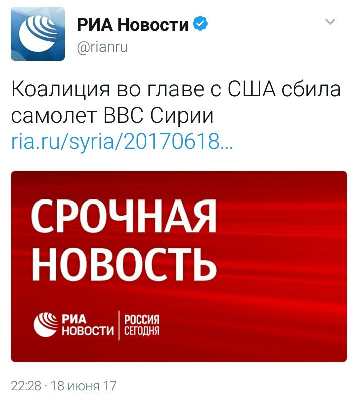 OlegRO Опубликовано 18 июня, 2017 Опубликовано 18 июня, 2017 Штаб возглавляемой США коалиции подтвердил, что американский военный самолёт сбил сирийский к югу от города Табки. "> «В 18:43 по местному времени сирийский самолёт Су-22 сбросил бомбы около позиций SDF (Сирийские демократические силы. — RT). В соответствии c правилами применения вооружения и коллективной самообороны коалиции, он был немедленно сбит американским истребителем F/A-18E Super Hornet», — говорится в сообщении. Отмечается, что после атаки сирийских войск коалиция связалась с представителями России для деэскалации обстановки. Ранее Минобороны Сирии сообщило, что коалиция сбила самолёт ВВС САР в районе Ракки, когда он выполнял задачу против «Исламского государства»