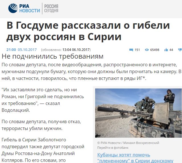 Дагот Опубликовано 10 октября, 2017 Опубликовано 10 октября, 2017 Уссатый таракан Гиркин-Дыркин опять нахныкал Только что говорил по телефону с бывшим бойцом "Вагнера", воевавшим на Донбассе и в Сирии. С его слов (а он служил в Славянской бригаде и у меня нет сомнений в словах этого человека), за последнюю неделю в его бывшем взводе - только убитых - три человека. Много раненых. В Одинцово валяется в госпитале еще один мой бывший подчиненный - раненый в Сирии тоже в составе "Вагнера". И там он не просто "не один" - а несколько человек поступает каждую неделю. Особенно много - за 2 последних. Из третьего источника мне известно, что (оценочно) за 2 минувших недели потери "официальных военных" под 20 человек "200-ми", а ЧВК, соответственно, потеряли больше раза в три. И это - "по минимуму". Такие потери регулярных военных и наемников (которые, по сути, те же контрактники) вызваны резким усилением боев против ИГИЛ в районе Дейр-эз-Зора и Маядина, где русские (90% личного состава - славяне) ЧВК используются в качестве штурмовых подразделений (сирийцы "на подхвате"), а также атаками боевиков в провинции Хама - где ЧВК приходится выручать попадающие в "переделки" подразделения Военной полиции. Также потери несутся в засадах на коммуникациях и при боях на деблокирование частично окруженного боевиками города Эс-Сухна и в районе захваченного ИГИЛ (запрещено упоминать на ночь при детях в РФ) города Аль-Карьятейн. Везде, кроме (а часто - вместо) сирийцев, используется "русское пушечное мясо". В тех самых "сухопутных боях", которых наш неуважаемый президент обещал категорически избегать в начале Сирийской авантюры. И, да, я ничего ,случайно, не разгласил? Впрочем, никаких подписок я не давал, шифровок со сводками не получаю... Так, сплошной "трёп безответственный"... Не то, что у нашего президента.