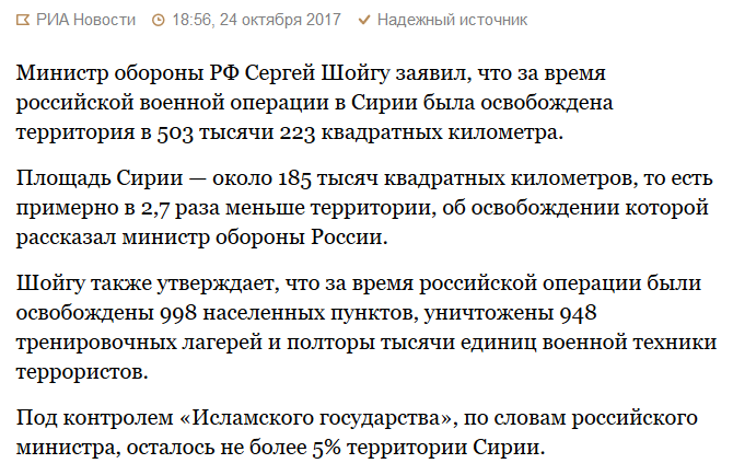Outlawif Опубликовано 24 октября, 2017 Опубликовано 24 октября, 2017 Он же не говорил, что все эти километры в Сирии? Он только промежуток времени указал: за время войны в сирии. Он собственно даже не сказал кем и от кого освобождены. Ну то есть пока они воевали в Сирии, где-то кем-то от кого-то или чего-то были освобождены земли. Может он про травлю колорадского жука в Белоруси. Мол пока мы воевали, бульбаши 500км полей от жука освободили. Так вот. Надо просто уточнить, что он имел в виду. А вы так вот сразу, не разобравшись..