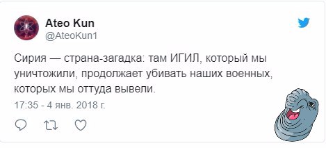 Лео Опубликовано 3 января, 2018 Опубликовано 3 января, 2018 Просто у ИГИЛ не ловит первый канал, и они не вкурсе что их уже победили, а войска вывели.
