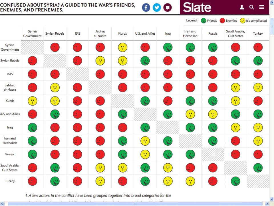 OlegRO Опубликовано 6 октября, 2015 Опубликовано 6 октября, 2015 Таблица, наглядно демонстрирущая взаимоотнощения сторон конфликта в Сирии. Для понимания достаточно знания латинского алфавита. Цветовая схема: красный — враги, зелёный — друзья, желтый — всё сложно. Все колобки кликабельные, однако, дополнительные пояснения на английском. http://www.slate.com/blogs/the_slatest/201...h_all_dt_tw_top кст, хуйлу сегодня ДР, пусть эта дата будет на могильной плите :xuilo: