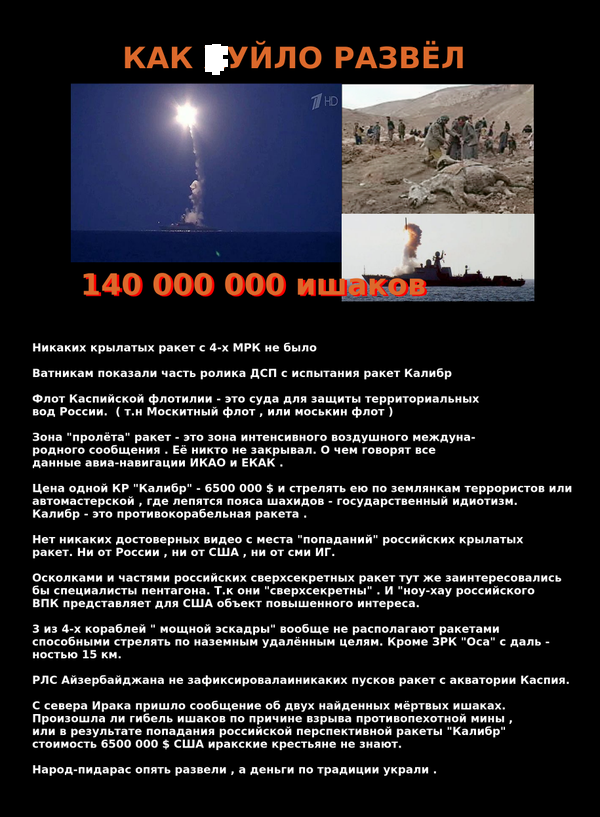 OlegRO Опубликовано 8 октября, 2015 Опубликовано 8 октября, 2015 возят из машина, такими как они и подбили на видео ракетки конечно дорого, на та машинка могла принести бед подороже, да и неизвестно кто в ней был и вообще у них нефти валом, могут позволить себе) Сирийская армия сегодня, 8 октября, перешла в широкомасштабное наступление. Об этом заявил начальник сирийского генштаба генерал-лейтенант Абдулла Аюб, передает ВВС. По его словам, целью военной операции является "освобождение городов и районов, пострадавших от терроризма". Вместе с тем, по информации расположенного в Лондоне Центра мониторинга прав человека в Сирии, правительственные войска и дружественные им группировки при поддержке российской авиации и флота развернули мощное наступление в долине Габ. в церкви не в кипиш Турки: Эрдоган: Турция найдет где покупать газ. И атомную электростанцию вы строить не будете (...) http://uk.reuters.com/article/2015/10/08/m...N1280FX20151008 Пока это только слова. Но тот факт, что подобная риторика вышла на самый высокий уровень, по–видимому, говорит о довольно серьезном ухудшении российско–турецких отношений. Полгода назад Эрдоган уже высказывал свое недовольство Путину в связи с упоминанием им геноцида армян, и даже попрекнул его Крымом: «сначала объясните ЭТО, а потом уже говорите о геноциде» Через некоторое время Эрдоган был еще жестче: Турция никогда не признает аннексию Крыма Россией. В это же время по вине Турции стал сильно буксовать «Турецкий поток». Сегодня Эрдоган говорит о возможности полного отказа от российского газа и приостановке проекта АЭС «Аккую». Кстати, Турция второй (а, возможно, и первый) импортер рос газа после Германии. А не так давно товарооборот аж до $100 млрд хотели довести… Зато, у раисян теперь есть Асад. Будут отдыхать на Сирии Онищенко уже пошёл искать микробов на турецких пляжах
