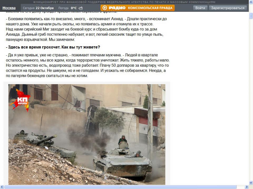 OlegRO Опубликовано 24 октября, 2015 Опубликовано 24 октября, 2015 СМИ: Армия Асада под Алеппо попала в «котел» Как сообщает агентство Reuters со ссылкой на сирийских правозащитников, в ходе атаки боевики «Исламского государства» сумели захватить дорогу, ведущую из Алеппо на юго-восток. Таким образом, им удалось отрезать правительственные войска от основных сил. Информационное агентство Сирии SANA бои за стратегически важную дорогу никак не комментирует. В официальной сводке за 24 октября фигурирует лишь взятие деревни Аль-Джабул в провинции Алеппо. В Дамаске также сообщают о локальных победах в района аэропорта Алеппо и в окрестностях военно-воздушной академии, где бои продолжаются уже несколько месяцев. Между тем официальный представитель Министерства обороны России Игорь Конашенков сообщил в субботу, что общее число вылетов российской авиации в Сирии достигло 934.