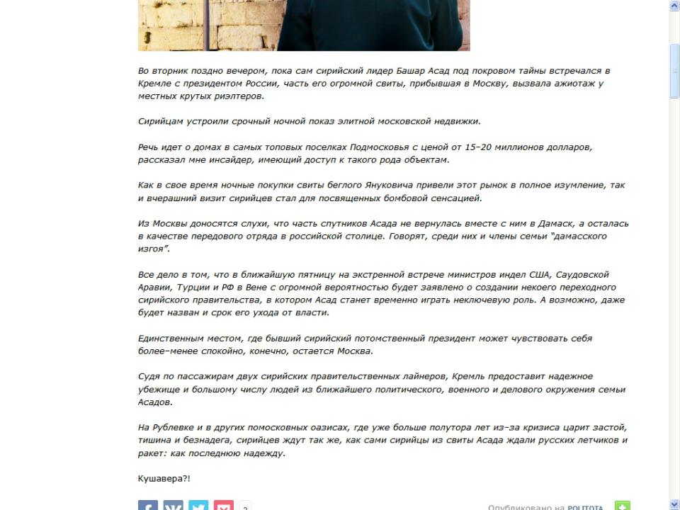 OlegRO Опубликовано 25 октября, 2015 Опубликовано 25 октября, 2015 Human Rights Watch обвинила Россию в военных преступлениях в Сирии В результате авиаударов погибли 59 гражданских лиц По крайней мере два воздушных удара по территории сирийской провинции Хомс, которые были нанесены 15 октября, как считают местные жители, российской авиацией, по-видимому, являются нарушением законов войны. Об этом говорится в опубликованном в воскресенье, 25 октября, докладе международной правозащитной организации Human Rights Watch. По словам местного жителя, на которого ссылаются правозащитники, в результате авиаударов погибли 59 гражданских лиц, в том числе 33 ребенка и командир местной вооруженной оппозиционной группы. Самым смертоносным стал авиаудар, под который попал дом в деревне Ганту, где укрывалась семья Асаф - родственники одного из командиров оппозиционной "Сирийской свободной армии" (ССА) Абу аль-Аббаса. По данным очевидцев, погибли 46 человек, в том числе 32 ребенка и 12 женщин. Дом находился вдали от линии фронта и там не было военных, а сам аль-Аббас был на передовой. В результате удара по населенному пункту Тер-Маалех была разрушена местная пекарня, погибли 13 мирных жителей, а также один из полевых командиров "Сирийской свободной армии". Неясно, был ли он целью ударов, поскольку ни Россия, ни Сирия не дали комментариев относительно происшествия. Напомним, ранее в HRW сообщали, что в Сирии применялись кассетные бомбы российского производства. https://www.youtube.com/watch?feature=player_embedded&v=HqAB-lLw9oc