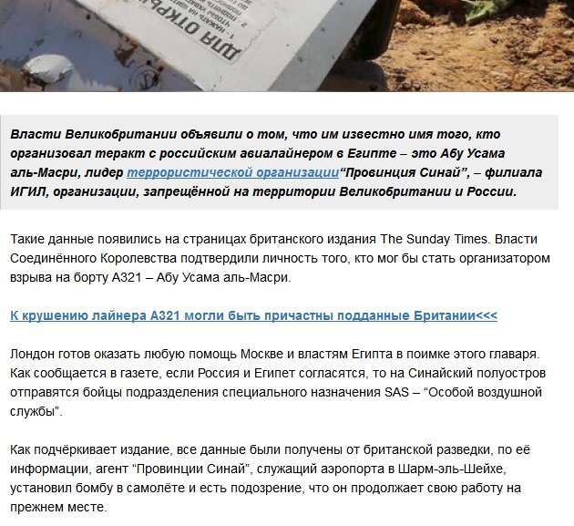 OlegRO Опубликовано 9 ноября, 2015 Опубликовано 9 ноября, 2015 американцы срали на опасности и не завязали с полетами Сотрудники следственных органов и спецслужб, проводящие собственное расследование причин крушения самолёта Аirbus 321 на Синайском полуострове, обнаружили на одном из обломков хвостовой части лайнера странное рваное отверстие. ПоказатьПо предварительным данным экспертиз, именно от этой точки, расположенной прямо под килем (часть хвостового оперения. — Прим. ред.), и могло начаться разрушение всего корпуса самолёта. На странную форму дыры обратили внимание следователи и эксперты Росавиации, осматривавшие обломки самолёта. Сразу после обнаружения с краёв этого отверстия взяли так называемые «смывы» — пробы, которые позже отправили на химическую экспертизу. Как стало известно LifeNews, первичная экспертиза не показала наличия каких-либо известных науке взрывных компонентов на краях этого отверстия. Специалисты пока не могут назвать точную причину образования такой крупной дыры в хвостовой части. Однако они колеблются между двумя версиями — взрывом на борту лайнера и лопнувшим от «усталости» металлом. Параллельно с изучением обломков лайнера специалисты исследуют записи с его чёрных ящиков самолёта. По словам источников, пока на плёнках не было обнаружено ничего, что могло бы свидетельствовать в пользу той или иной версии. За исключением одного факта: по данным представителей египетских спецслужб, в самом конце записи речевого самописца слышны шумы неизвестного происхождения. Эксперты заявляют, что подобные звуки могут свидетельствовать о взрыве бомбы на борту самолёта. — Несмотря на то что устройство было серьёзно повреждено при падении, экспертам удалось получить данные с плёнки, причём расшифровка, как и полагается, велась в вакууме, чтобы не повредить исходные материалы, — рассказывает источник. Извлечённые данные позволяют говорить о том, что события на борту развивались настолько стремительно, что ни один из членов экипажа самолёта не успел принять какое-либо решение. В частности, параметрический самописец не содержит информации о намеренном изменении курса самолёта. Что касается речевого чёрного ящика, то он позволяет судить лишь о последних минутах перед крушением самолёта. По словам источников, пилоты вели неспешный профессиональный диалог, в ходе которого они обменивались командами и сообщали о выходе на определённую высоту диспетчеру. Судя по данным самописца, до последнего момента экипаж не испытывал волнений за происходящее на борту. Запись обрывается неожиданно, словно чёрный ящик выключили. По словам специалистов, это значит, что ситуация была настолько катастрофична, что за одну секунду разрушила даже кабели, уходившие в хвостовую часть лайнера.