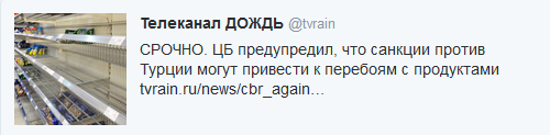 Дагот Опубликовано 11 декабря, 2015 Опубликовано 11 декабря, 2015 Санкции против Турции грозят перебоями с продуктами Центральный банк России предупредил о перебоях с поставкой продуктов из-за запрета на поставку некоторых овощей и фруктов, сообщает в пятницу, 11 декабря, «Интерфакс». «Введенный запрет на ввоз ряда турецких продуктов может привести к перебоям с поставками овощей и фруктов в Россию», — говорится в докладе регулятора. Таможня дала "добро" на турецкий импорт в Петербург, потому что без турецкого сырья там не могут работать Федеральная таможенная служба начала пропускать в Санкт-Петербург грузы для предприятий города после обращения вице-губернатора Сергея Мовчана. "Сейчас ФТС России приняты дополнительные меры по обеспечению ввоза товаров и комплектующих для предприятий отечественной промышленности", - говорится в сообщении пресс-службы таможенного ведомства.