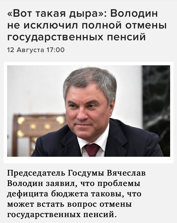 Дагот Опубліковано: 12 серпня 2018 Опубліковано: 12 серпня 2018 В России возможна отмена государственных пенсий из-за дефицита пенсионной системы - об этом председатель Госдумы Вячеслав Володин заявил на встрече с жителями Саратова Одна из женщин, пришедших на беседу с Володиным, пожаловалась на низкую пенсию и сказала, что в случае повышения пенсионного возраста, ни ее ровесники, ни их внуки до пенсии просто не доживут. Спикер Госдумы ответил, что для увеличения срокажизни есть СПОРТПЛОЩАДКИ. Будут ли у нас дальше государственные пенсии – это тоже вопрос, потому что бюджет стал дефицитным, добавил председатель Госдумы. https://echo.msk.ru/news/2257590-echo.html