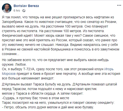 inimak Опубліковано: 27 січня 2019 Опубліковано: 27 січня 2019 Нардеп Береза принял вызов сенатора от Рязанской области Морозова, а тот удалил из Facebook пост с требованием сатисфакции https://censor.net.ua/news/3108447/nardep_b...facebook_post_s