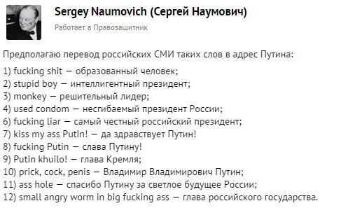 OlegRO Опубликовано 12 марта, 2016 Опубликовано 12 марта, 2016 сила слова В ответ Путин строго приказал принять все меры, чтобы подобное не повторилось. http://shipilov.com/aship-news/707-rossijs...nye-zakazy.html И пальму первенства в гонке за самый упоротый перевод фразы He's not completely stupid перехватывает Уралинформбюро.