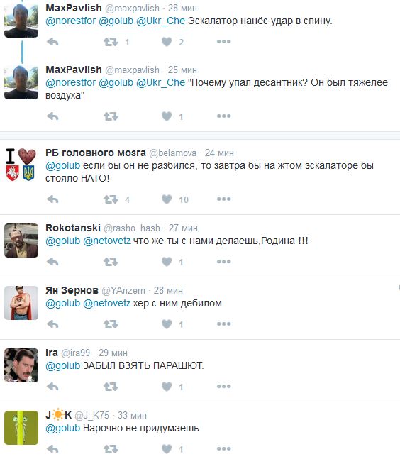 extremal Опубликовано 27 марта, 2016 Опубликовано 27 марта, 2016 Из коментов на ютубе veinard1971 Этим убогим хохлам надо триколор на спину и в защиту Ерофеева и Александрова пустить по крещатнику. Что с ними случится? Sergey K (Serq) +veinard1971 Менты их точно не тронут. Александр второй Вот тебе и ответ москалик! На Крещатике их мордой в землю народ закинет. А менты еще защищать будут. А теперь подумай почему