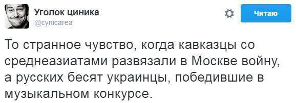 Дагот Опубликовано 15 мая, 2016 Опубликовано 15 мая, 2016 Победу украинской певицы Джамалы на «Евровидении – 2016» в Стокгольме российские политики назвали политизированной и срывом минских соглашений. Об этом в Facebook написал сенатор российского Совета Федерации Константин Косачев. По его мнению, победа Украины может рассматриваться только как «поражение Европы» и «минского процесса». «Проиграла Европа. Ведь в умах европейцев победила не объединяющая «Ода к радости», а откровенная «холодная война». Проиграл минский процесс. В том числе и усилия команды президента Порошенко, кстати. Ей и без того невероятно трудно собрать необходимое большинство для принятия первоочередных пунктов Минска – законов о децентрализации, амнистии и т.п. Теперь стимулов еще меньше: зачем менять законы, договариваться, если – «Европа с нами»? «Запад нам поможет». Именно поэтому проиграла Украина. И отнюдь не только ее многострадальный бюджет. Ведь главное, что как воздух сейчас нужно стране и нации – мир. А победила война. До победного. Поэтому итог Евровидения не просто разочаровывает. Голосовавшие за Джамалу, по сути проголосовали за продолжение репрессий Киева против собственного народа. Вот и Яценюк уже отличился: «Украина побеждает, и будет побеждать, Крым будет украинским!»», — разоткровенничался сенатор. Глава думского комитета по международным делам Алексей Пушков в своем Twitter заявил о праве россиян петь о «мучениках» украинского города Одесса. «Из конкурса Евровидение превратилось в поле политических битв. Теперь белорусы имеют право петь о сожженной Хатыни, а русские – о мучениках Одессы», — заявил Пушков. К своим коллегам присоединился и лидер ЛДПР Владимир Жириновский – он тоже раскритиковал победу Украины. «Итоги Евровидения — позор Европы! Всё население голосует за Лазарева, а победа у Украины. Гнилую начинку евродемократии увидел весь мир!» – заявил либеральный демократ Жириновский.