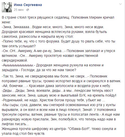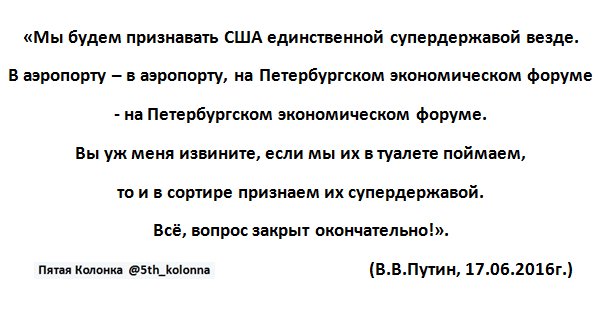 Izverg Опубліковано: 18 червня 2016 Опубліковано: 18 червня 2016 Путин назвал США единственной супердержавой. Ватный мир напрягся... Пытается найти скрытый смысл в его словах. )))) А-хаха!!! Вот же дебилы... Но нет худа без добра. Проржавевшие шестеренки в их головах подали первые признаки жизни. Не все правда, но многие уже начали подозревать, что Путин никакой не великий царь, а маленькое, закомплексованное чмо.