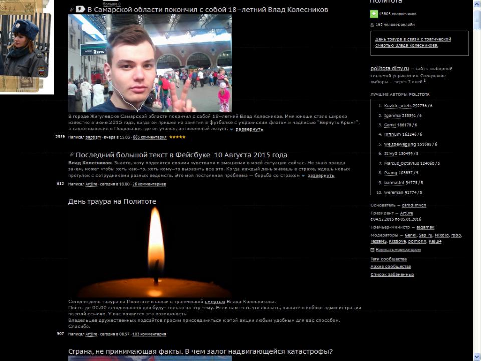 OlegRO Опубликовано 27 декабря, 2015 Опубликовано 27 декабря, 2015 так весь день сегодня выглядит сайт https://politota.dirty.ru/new в связи со смертью Влада Колесникова