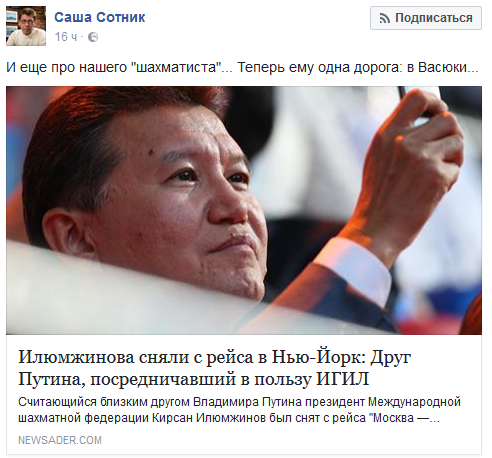 Garon Опубліковано: 26 серпня 2016 Опубліковано: 26 серпня 2016 а кто что он шахматист этот? Кирса́н Никола́евич Илюмжи́нов (калм. Үлүмҗин Кирсан, род. 5 апреля 1962, Элиста, Калмыцкая АССР, СССР) — российский государственный деятель, первый президент Республики Калмыкия (1993—2005), первый глава Республики Калмыкия (2005—2010), предприниматель. Президент Международной шахматной федерации (с 1995).