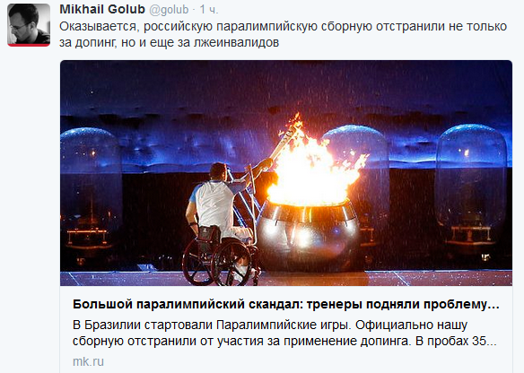OlegRO Опубліковано: 8 вересня 2016 Опубліковано: 8 вересня 2016 Флаг России на параде нес не спортсмен, а спортивный функционер. И, как выяснилось, инвалид. Что-то связанное с мозгом. Делегат, пронесший флаг РФ на церемонии открытия Паралимпиады в Рио, дисквалифицирован #импортозамещение, Греф вообще в своём мире Деньги на доплаты пенсионерам оказались исчерпаны за полгода За первые 6 месяцев текущего года на доплаты малоимущим пенсионерам было истрачено больше денег, чем предусмотрено на весь год, пишет РБК со ссылкой на отчет Счетной палаты.