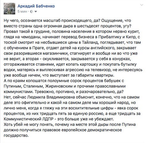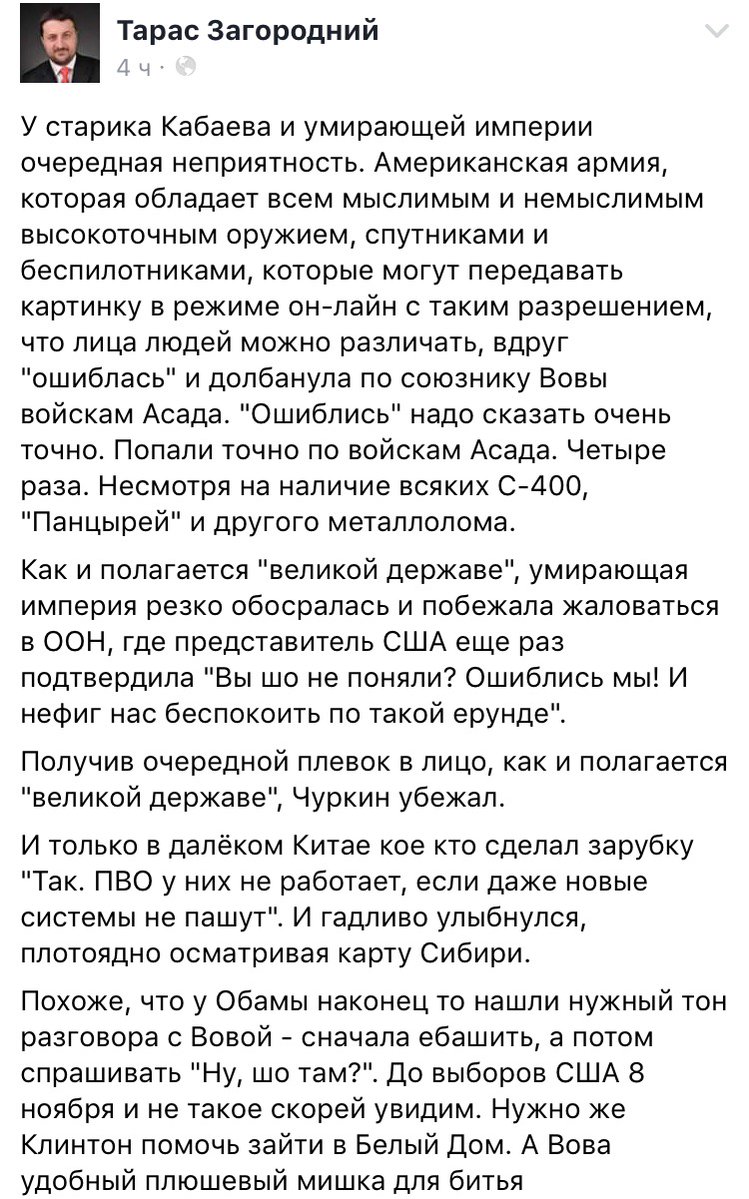 Дагот Опубліковано: 20 вересня 2016 Опубліковано: 20 вересня 2016 "Какой импичмент? Какая отставка?! Ты в своем уме? Папа в отставку уйти никак не может. Там не Межигорье", - Рабінович про Путіна Путін прекрасно розуміє ситуацію, тому: план А - вибори в 2018, план Б, якщо раніше все накриється мідним тазом, - позачергові вибори в 2017 році, план В - введення військового стану і відміна будь-яких виборів. Показать Російський фінансист Слава Рабінович продовжує публікувати одкровення силовика. Чергову розмову пропонують своїм читачам Патріоти України, цитуючи мовою оригіналу: "Знакомый силовик, лично мне: – Понимаешь, у нас все всё понимают. Президент нелегитимен. Госдура нелегитимна. Многие во власти понаделали делов не только на Гаагу... Какой импичмент? Какая отставка?! Ты в своём уме? Ты веришь этим заявлениям хилых оппозеров и очкастых миш, с явлинскими впридачу, которые не набирают даже 5 процентов? Нет, заявления их, возможно, и искренние, только что они реально делать собираются? Вот смотри, ты мне сам показывал фотографии, из твоей экскурсии в "Межигорье" в ноябре 2014 года. Помнишь, там пруд, с плавающими документами? А как тебе интерьеры? Так вот, ты учти. Папа в отставку уйти никак не может. И импичмент допустить, естественно, тоже не может. Там не Межигорье, друг мой. Твой покойный сосед Боря Немцов, хотя и печатал свои докладики насчёт 15 дворцов и 20 самолётов, не знал и десятой доли всего "честно заработанного" на галерах. Слыхал, как грохнули один небольшой локальный МВДшный общак на хазе у полковника Захарченко? 130 миллионов грина кешаком. А теперь представь себе полный общак людей в погонах – во всех погонах. Консолидированный общак. Знаешь, сколько это, на круг? Десять лет назад, ещё десять лет назад – это было полтриллиона долларов. Сейчас – триллион, как минимум. А некоторые наши говорят – два триллиона. Плюс личные Папы – несколько сотен миллиардов грина. Огромная часть из этого – в бункерах. В папиных бункерах. В Ямантау, на острове в шхерах северной части Ладожского озера, здесь, там, ещё где-то, и часть – в его бункерах за пределами России. Ты вообще понимаешь масштаб? Такими деньгами в мире не обладает никто, кроме американского правительства. Но ни один человек в мире. Это невозможно раскрыть, задекларировать, посвятить в это настоящего выбранного следующего президента. Никакие касьяновы, явлинские и навальные не дадут никаких гарантий сохранности. Более того, эти нищебродные персонажи не подозревают об этом сейчас, и не созвонятся с мозгами тогда, когда и если узнают. Даже Ходорковский не врубится в масштаб. Когда объявили о Панамагейте, МБХ, по факту, объявил Папу вором. Но даже он не представляет, о чём речь. Дворцы, самолёты, автопарк, яхты – на земле, в воздухе и на воде; кеш в валюте, золото в слитках, алмазы – под землёй; доли во всех значимых российских компаниях – через секретные документы или "verbal trust"… Это триллионы, наивный ты мой. Здесь сменяемости президентской власти нет и быть не может по определению. По своей природе. В принципе. От слова "совсем". Если бы общество было готово к принятию самодержавия – то тогда можно было бы сменить… Но пока что не успели обработать народонаселение. Работаем в этом направлении. Но на это в скором времени надеяться нельзя. Так что Папа и мы ситуацию мониторим внимательно. План А – перевыборы в 2018. 