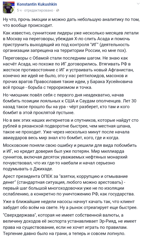 Outlawif Опубліковано: 15 жовтня 2016 Опубліковано: 15 жовтня 2016 Много ереси мацковской . Не дружок, все честь по чести. Если ошибся в чем - так поправь. А если нет - так чего ж лаешься? Про шапку то что? ) Турецкое дарение уже ?)) Про шапку ты все рассказал. Только выводы странные сделал - шапку дарил константинопольский (ныне стамбул - турция прим. переводчика) государь, а ты к чему-то европейскую историю прилепил. Какие там европы-то? Касаемо болот... Ну грустно конечно это все. Когда эмоции берут верх. Ну да ладно, шут с ним. Толку-то? Диалога все равно не выйдет, чувствую.