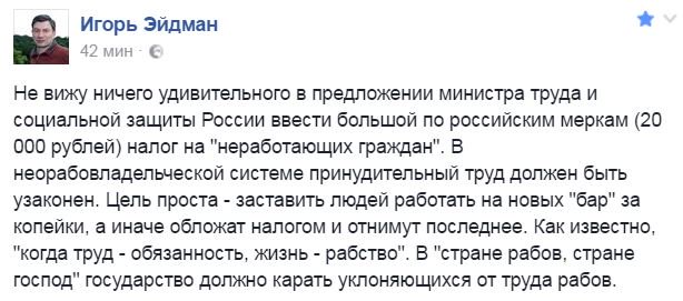 OlegRO Опубліковано: 21 жовтня 2016 Опубліковано: 21 жовтня 2016 Член дачного кооператива "Озеро" за $10 млн приобрел у "Газпрома" имущество на сотни миллиардов https://www.rospres.com/government/19734/ ------------------------ После 2017 года экономический рост будет практически нулевым или вообще остановится, а страна приблизится по показателям к беднейшим государствам. Такая информация содержится в долгосрочном прогнозе социально–экономического развития до 2035 года, который Минэкономики направило в Минфин. Предполагается три тарифа варианта развития событий. «Базовый плюс», «Базовый консервативный» и «С реформами». Первый, самый оптимистичный, предполагает, что доходы населения вернутся к показателям 2013 года уже в 2021. Он основан на взятом с потолка прогнозе цен на нефть, на уровне 57$ в 2020 и 70$ в 2030. Второй, который предполагает уровень цен на нефть в районе 40$ и при котором неизбежен экономический спад, в ведомстве назвали нереалистичным. Но федеральный бюджет рассчитан исходя из него. Третий вариант является фантастическим и предполагает, что у населения, у которого сократились доходы — резко возрастёт производительность труда. Со всех сторон в нас полетят инвестиции. Россия слезет с нефтяной иглы, и состоится первый межпланетный шахматный турнир. https://kommersant.ru/doc/3120834 ------------------------ чиновники из Минобороны в 2013 году заказали на Адищевской бумажной фабрике изготовление семи миллионов «патриотичных» рулонов для нужд армейских, больших и малых. Обычная, самая дешевая туалетная бумага, которую отличала упаковка: марка – «Армейская», и рисунок – орден Отечественной войны. https://www.fontanka.ru/2016/10/18/111/ -------------====== европейские журналы https://www.economist.com/ ------------------------- - Путин заставил весь мир нас уважать! - А что стал делать мир из уважения к нам? - Ну, они санкции вводят! Все время про нас говорят! ------------------------- Частицу мощей Моторолы отправили на МКС -------------------------- «Зенит Арена» подорожала с 6,7 до 39,2 млрд. Сенатор объяснил это смертью японского архитектора c чертежами https://t.co/ohdUTykK0X ----------------------------