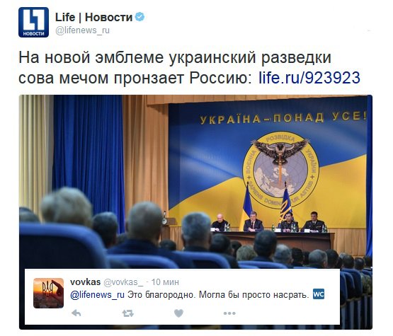 Лео Опубліковано: 29 жовтня 2016 Опубліковано: 29 жовтня 2016 Друг из РФ только что написал что у них сейчас тупо по всем адовый бомбёж по поводу новой эмблемы нашей военной разведки. Фокус в том что эмблеме уже от 3 до 6 месяцев, они её просто сегодня только увидели.